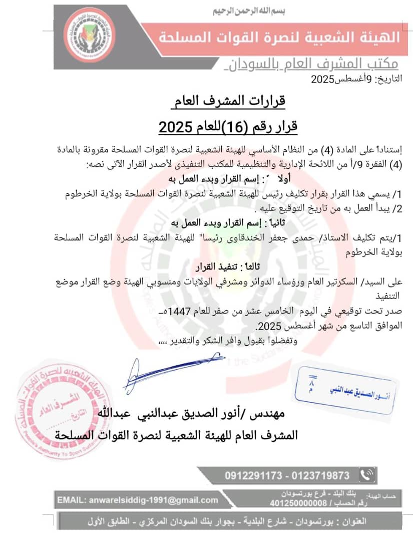 1/ يسمي هذا القرار بقرار تكليف رئيس للهيئة الشعبية لنصرة القوات المسلحة بولاية الخرطوم