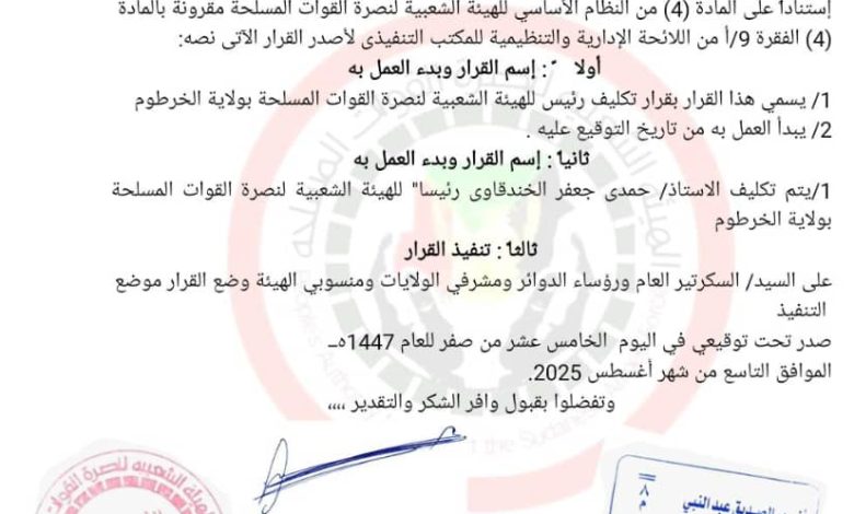 1/ يسمي هذا القرار بقرار تكليف رئيس للهيئة الشعبية لنصرة القوات المسلحة بولاية الخرطوم
