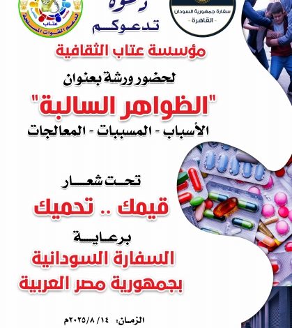 تحت شعار قيمك تحميك برعاية السفارة السودانية بجمهورية مصر العربية يوم الخميس الموافق14اغسطس الجاري من الساعة الواحدة ظهرا إلى الخامسة عصرا